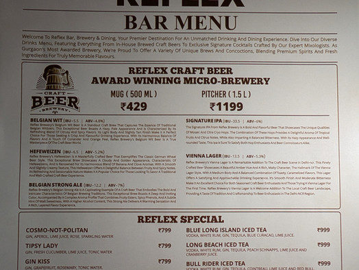 Reflex Bar Brewery & Dining, located in the M3M International Financial Centre, is maybe Gurgaon 's most upscale and visually striking brewery in Gurgaon. With its sleek design, ambient lighting (which unfortunately made it difficult to capture through my camera!), and spacious layout, Reflex offers a luxurious take on the craft beer experience. It's not just a bar—it's seemed to me that it was a lifestyle venue where design, dining, and live music come together, creating a vibrant and immersive atmosphere.